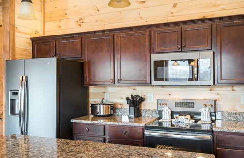Welcome to The Bear and Trout Cabin, your ultimate Smoky Mountain retreat. This newly built, four-bedroom, four-bath cabin combines modern luxury with mountain charm. The open-concept main level boasts a beautifully furnished living room featuring a gas fireplace, a large-screen TV, and expansive windows that frame the breathtaking views. The fully equipped kitchen includes stainless steel appliances, granite countertops, and all the cookware and dinnerware needed for creating delicious meals. Adjacent to the kitchen, the dining area offers ample seating, perfect for gathering together over meals or late-night card games.