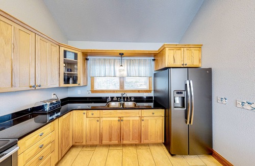 Three bedrooms with TVs, en suite bathrooms, and access to decks on the first level. You'll also find a game room with a foosball table, a TV, and a full-size fridge to store your snacks and goodies. This level also offers access to a covered deck with a private hot tub overlooking the enclosed yard, where a sparkling private pool will be waiting for you, and a laundry room with a washer/dryer. The pool area has two picnic tables, a gas grill, and a bar area with warm nighttime lighting, perfect for fun poolside meals.