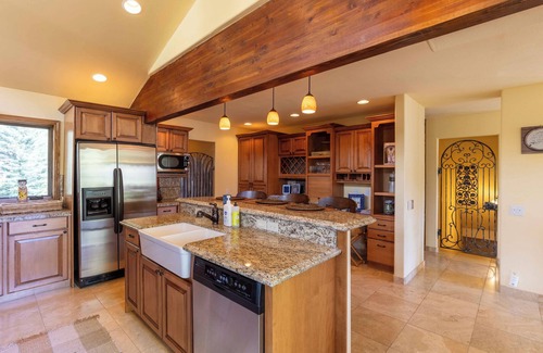 The kitchen is a chef's dream, complete with a professional-grade stove, large island with bar seating, and a wine fridge to ensure your favorite bottle is always perfectly chilled. Just off the kitchen is a cozy little patio nestled among the aspens—an intimate spot for morning coffee with a secret view of the mountains peeking through the trees.