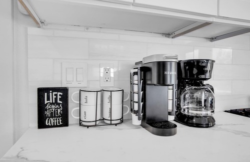 This modern home opens up to a spacious living room with a family kitchen with an enormous island area that sits six people. There is plenty of room in the living room to lounge in front of a 86-inch smart TV. The beautiful dining area features a dining table with seating for 8. The fully-equipped kitchen features stunning stainless steel appliances, including a side-by-side refrigerator with a water and ice dispenser and offers everything from A to Z! Utensils, pots and pans, plates, cups, wine glasses, shot glasses, mugs, bakeware, and some spices, condiments and oils are provided. Also, a toaster oven, blender, Keurig coffee maker, and electric kettle.