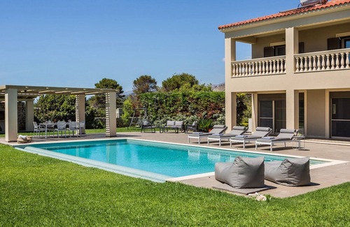 The villa boasts a sprawling lawn and meticulously maintained gardens, surrounding the magnificent large infinity pool with breathtaking views of the Ionian Sea.