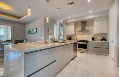 Inside the home, you'll find the open kitchen with stainless steel appliances, quartz countertops and a waterfall island with additional seating for 4. The kitchen is fully equipped with everything you need, including a Ninja® blender and a Keurig® coffee maker with a starter pack of assorted pods. The dining area offers an unobstructed view of the pool and canal and has a dining table for 6.