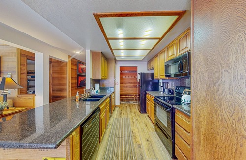 Step inside to find an entryway with a bench and hooks to assist you in the removal of your boots, socks, and coats. You'll immediately warm up in a living space accented with natural wood, large windows, and charming decor inspired by the outdoors. The living room has a pair of comfortable sofas, a flatscreen TV (with a DVD player) mounted above the hearth, and sliding glass doors that lead to a patio overlooking the pool deck. On the other side of this open room are a window seat where you can review the morning snow report, a dining room table with seating for six, and a fully equipped kitchen with black appliances and a peninsula breakfast bar for two. Additional amenities include free WiFi throughout the condo and a flatscreen TV (with cable) in the primary bedroom suite.