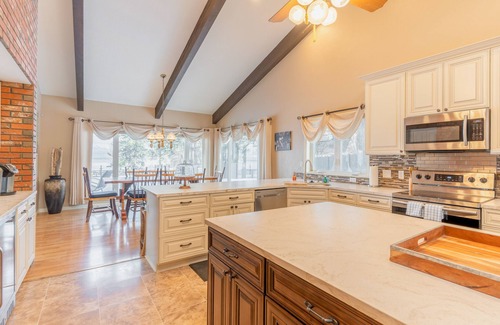 Upon entry, you'll be met with a bright interior and a cozy atmosphere throughout the well-appointed living area. Relax and make yourself at home by resting on the plush furniture, streaming a movie on the large TV, challenging your loved ones to a game on the foosball table, or curling up with a good book by the wood-burning stove. Hobby chefs will love preparing grand meals and lake picnic snacks in the stunning kitchen, equipped with stainless steel appliances, a breakfast bar with six stools, a floating island countertop, and a formal dining table with a 180-degree view. Comfortable beds in spacious bedrooms ensure that everyone will receive a wonderful night's rest from the day's adventures. A deluxe bedroom boasts a TV for private viewing, an entrance to the patio, and a lovely en suite jetted tub. The majestic main bedroom is outfitted with a TV for private viewing and floor-to-ceiling windows with a sitting area boasting breathtaking lake views. There is an air hockey table and xbox available as well!