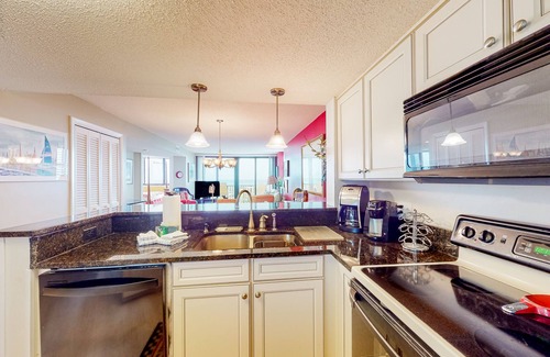 Bright and inviting, the condo comes well-appointed for modern coastal comfort. The private balcony is a great place to watch the sunrise, but it also makes a perfect spot for happy hour with a wet bar equipped inside for mixing up your favorite libations. The kitchen comes with everything you need for home cooking, a breakfast bar, and a formal dining table for making memories. The airy living room is furnished for comfortable home lounging. Stream your favorite shows and movies on the TV or browse the web with complimentary WiFi. Central air-conditioning and a private washer/dryer are also equipped for added convenience and comfort.