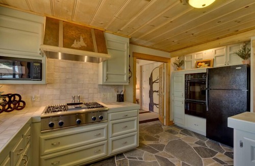 Featuring filtered views of picturesque Lake Tahoe and doors and log trim hand painted by a local artist, the stunning kitchen includes seating for four at the breakfast bar, a Thermador gas cooktop, double ovens, a full complement of cooking utensils—everything you need to create homecooked meals. The dishwasher makes cleanup easy.