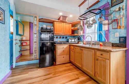 The Mermaids Den is a colorful and fun studio space perfect for a or a parent traveling with their child, it's a unique and entertaining place to be. This well-planned 300 square foot space is whimsically aquatic themed with many beautiful handmade features. In addition, it has everything you need to make you comfortable, including a large bathroom with a tub/shower combination, and a fully stocked kitchenette. There is also an attached shared laundry room with a large washer and dryer. The shared backyard is fenced with landscaping including flowers and blueberry bushes. We allow one small pet, 30 lbs or less. Make sure to clean up after the pet immediately. This is a no shoes, no smoking, no partying property.