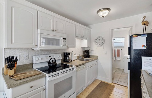 The well-equipped kitchen boasts modern appliances, including a refrigerator, stove, microwave, and coffee maker. You’ll find all the essentials to prepare delicious meals, from cookware to utensils. Enjoy your culinary creations at the quaint dining nook that comfortably seats two.