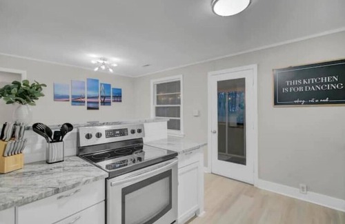 The den and 2 of the bedrooms feature Roku smart TVs so you can sign into your favorite streaming apps! There is also a 4k HD digital antenna in the den with all the network channels ready to go. The master bedroom features a super comfy memory foam KING bed, smart TV, USB charging ports in all bedside lamps and plenty of closet space! Both of the other 2 bedrooms are also well equipped with quality memory foam queen beds, high quality bedding and plenty of storage. If needed the den area sofa can be pulled out for an additional queen bed. There is a dedicated work space in the den if you need a quiet place to get some work done and a foosball table for when work is over! The dining room is furnished with a large table that is able to seat 8 for those big family dinners! In the bathroom we supply extra plush towels and luxury Gilchrist & Soames brand soap, shampoo, conditioner and lotion. The fully equipped kitchen has everything you will need to cook your favorite meals at home and we also supply a Keurig coffee maker and a few assorted pods. The large back porch is a great place for your morning coffee, and has a large table for dining outside as well. There is also a washer and dryer room located in the screened in porch.