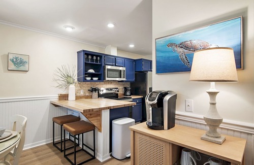 ⭐ It s a Shore Bet offers 2 bedrooms, 2 bathrooms, and an open floor plan with modern appliances, fresh furnishings, and updated lighting! The Master Suite includes a King bed and private en-suite bathroom with a double vanity. The Guest Bedroom also features a King bed and shares a hallway bathroom. Relax on the screened-in patio or spend evenings in the spacious backyard with a fire pit and patio string lights. The backyard is fully fenced in so it s private, serene, and a perfect place to relax! A full-size washer and dryer are available for your convenience. The garage includes a beach tent, wagon, small and large dog kennels, and other beach essentials.