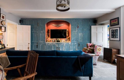 The living room, which was the kitchen of the house, has a large chaise-style sofa, several ridiculously comfortable victorian armchairs, a William IV Indian Rosewood dining table and sideboard, a printer and monitor for those who just *have* to work, and a 55" television with surround sound system. It features original Georgian panelling, window shutters, flagstone floor and kitchen range.