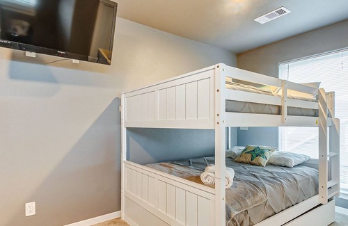 When are winding down for the evening and you make your way upstairs, you will find all the bedrooms: a king bed and an en suite bathroom are the first bedroom; the second bedroom with 2 sets of queen over queen bunk beds and a trundle will sleep 9-10 guests, while the third bedroom offers a queen bed and shares the hallway bath. The fourth suite offers the best view in the house at the end of the hall with a full bed and an en suite bathroom.