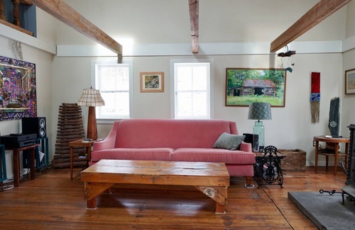 A summer experience you are sure to treasure. Come spend July on our 14 acre home in the heart of the Catskills. This beautiful farmhouse dates back to 1860 and is brimming with history. Fill your days with walking in the woods, exploring the wonders of the Catskills and swimming in our very own 100x30 foot fresh water swimming hole. Enjoy your meals at the long kitchen table, in the sunroom, or in the open air stream side porch. A variety of areas for reading, relaxing, meditation, or simply soaking in the beauty are at your fingertips. A gorgeous stream runs through the property and you can find centuries old bluestone walls throughout. The house has 3 bedrooms, a den with a pullout couch, several work space options, and 5 out buildings including a huge, classic Dutch barn.