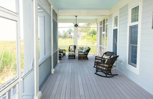 June's Retreat is Chincoteague Island's premier luxury vacation rental home, nestled on serene waterfront marshlands just north of town off of Main Street. This custom designed and decorated home leaves no detail unnoticed. From the bright spacious rooms with floor-to-ceiling windows to the expansive wrap-around verandas, you'll feel as though you're one with nature and your surroundings. Downstairs features a chef's quality kitchen, private billiards room, waterside glass atrium, living room, private den, formal dining room, sitting room and a bathroom. Upstairs you'll find 4 bedrooms with bathrooms (en suite), a sitting area and balcony. The panoramic views of Chincoteague Bay are unobstructed and unsurpassed. Come and see for yourself; we promise you won't be disappointed!