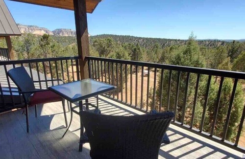 Juniper Ridge Casita is a beautiful addition to our luxury cabin. The majestic views are sure to impress and leave you with a renewed sense of peace and calm. Juniper Ridge not only provides the most exceptional view of the world famous Sugar Knoll rock formation but the private serenity of home. Enjoy amazing amenities and spot deer and turkeys walking through the trees. Ideally located retreat between Zion and Bryce National Parks where you can enjoy endless adventures. This casita sleeps 6.