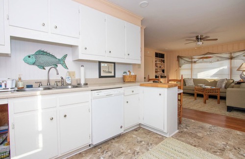 Inside, you will find simple wooden furniture and nautical decor. The kitchen does offer the modern appliances and plenty of room to cook the catch of the day! The 3 bedrooms offer a king bed, full bed and two twin. In the sunroom, there is a pullout couch with a queen sleeper for those extra guests that you just could not leave behind.