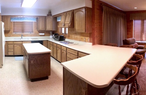 Two-story log lodge with two decks and breath-taking views overlooking the Tonahutu (North Inlet) rapids – within view of, and a 2-minute walk away from Grand Lake – the largest and deepest natural lake in Colorado. Large bay window and sliding glass door offer great (and relaxing) view of the North Inlet just feet away. All wood interior and four full-size bedrooms, each with a queen-sized bed. Living room and upstairs family room, each with TV, DVD and a queen-size sofa bed. One full bath with tub and shower, plus 2 bathrooms with showers. Large kitchen with island, counter seating, wall oven, full-size refrigerator, dishwasher and microwave. Free internet with wifi. Entire cabin was recently re-carpeted.