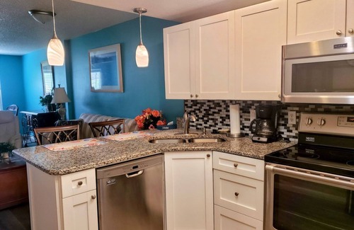 This condo includes a full kitchen, a dining area and a living space, a washer-dryer as well as two large bedrooms, each with a king-sized bed and en-suite full bath.