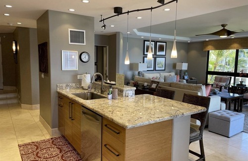 . This luxury “Premier” Two Bedroom / 2 bath Direct Oceanfront condo offers breathtaking PANORAMIC OCEAN sunsets and unobstructed views of the blue Pacific with expansive views of Lanai and Molokai. We have installed new Lanai doors that retract back to let the outside in! Our PRIVATELY rented premier condo will sleep up to a party of six comfortably and offers 1,900 square feet of pure direct oceanfront luxury . “Premier” assures you that this is the best! Our direct Oceanfront luxury condo included upgraded designer furniture, stone countertops, travertine flooring, a beautifully appointed kitchen with Pod Keurig Coffee Machine and a handlful of pods for your check in day. We also present our designed baths. Entertainment amenities will include flat sceen Smart TV's, and I-HOME PLAYER SYSTEM , with Wireless internet service available in the condo. You will be completely dazzled and amazed when you walk thru the front entrance.