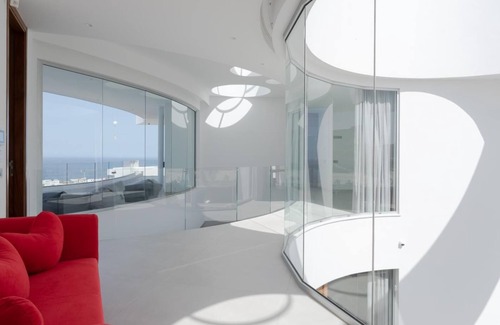 KARAT Villa Fibonacci is a truly sumptuous modern villa offering spectacular views of the island of La Gomera and part of the southern coast of Tenerife. This newly built property has a lot of clean, curved lines that define the style, modern minimalist architecture. Perched high on the hillside, the villa is only about a 5-minute drive from Las Americas beach.