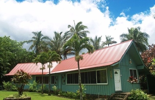 The Wainiha beach house brings you old style Hawaii in a jungle setting with a stream flowing in your back yard. Built in 1963 of Polynesian design, the house was the dream of Peggy Slater, known as the Amelia Earhart of sailing. Waterfalls, rainbows, crashing surf, fragrant flowers and exotic colorful birds will surround you. PLEASE NOTE: If you are sensitive to noise, the home is located on a "slow driving" section of Kuhio Highway which at certain times of the day you can hear the passing cars going over the one lane bridge. Home has high speed wireless internet, phone, cable tv, and full kitchen. Cell service is very spotty at the rental property.