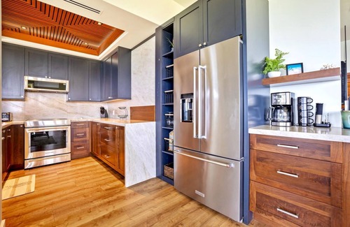 The modern kitchen is fully equipped and artfully designed, featuring granite countertops, stainless steel appliances, and rich wood finishes, perfect for preparing sunset dinners or leisurely breakfasts. Adjacent, the dining area offers the perfect setting for intimate meals with the ocean as your backdrop.