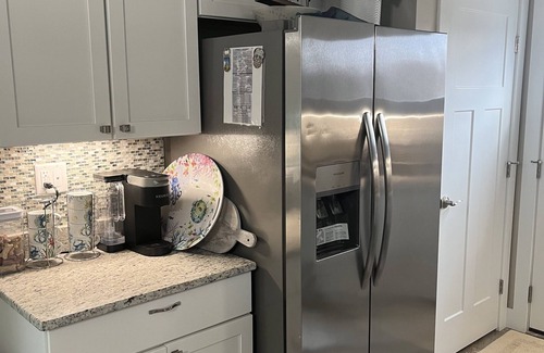 The kitchen features granite countertops and stainless steel appliances along with a toaster, Keurig coffee maker, ninja blender, air popper, instant pot, hand blender, immersion blender, kitchenaid stand mixer, and can opener. There are multiple utensils, cookie sheets and casserole dishes. The pantry contains all the spices and seasonings you could need for a gourmet dinner.