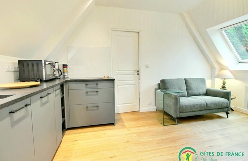 Apartment located on the first floor of the owners' house organized as follows: - Independent entrance with dressing room - Kitchen open to the living room/living room - Bedroom with 160x200 bed - Bathroom adjoining the bedroom with shower and WC Access to the apartment is via an exterior staircase. Parking spaces in front of the gîte. In a quiet environment, take advantage of this all-inclusive accommodation for a peaceful vacation. Between stone, land and sea, everything is there to get away from it all and fully recharge your batteries. Located opposite the village common (collective outdoor plot), you can reach the Auray River and the Gulf of Morbihan on foot via the paths. Locmariaquer, a small peninsula located between the Gulf and the ocean, is a small resort full of charm. You will find shops, small marinas and beautiful beaches accessible by paths. Renowned for its megalithic sites, lovers of old stones will be able to discover very beautiful sites in the town. Discover the large Broken Menhir just 1km from the gîte. Ideal starting point for exploring South Morbihan, don't miss an excursion to the islands departing from the port of Locmariaquer! (port of Guilvin)