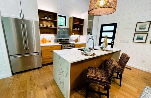 From the stainless-steel fixtures, high-end Kitchen Aid appliances, wicker and seashell lighting, custom open cabinets, and waterfall edge porcelain countertops, the designer kitchen was designed to be chic yet casual. Within this well-appointed kitchen, you will find all the small appliances, utensils, and serving dishes needed to prepare a gourmet meal or a simple late-night snack. Sit at the kitchen table and enjoy your morning coffee while your loving chef makes you a delicious breakfast (or vice versa).