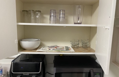 Full kitchen with cookware, dinnerware as well as air fryer, crockpot, blender, microwave and filtered coffee pot. Dining table with ample seating and leaf for table. Gas BBQ availble on back patio.