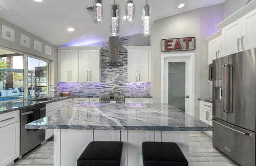 The open concept flow of the home will lead you to the bar area, which features a built-in refrigerator that can be stocked with an assortment of beer and soda, and everything you need to prepare your favorite cocktail (Bar stocking at extra fee). The adjacent dining area, which can accommodate up to six guests, sits just inside the French door access to the pool deck, making it the perfect spot for enjoying a meal with loved ones. Our "power bar" provides convenient storage and charging for all of your electronic devices.
