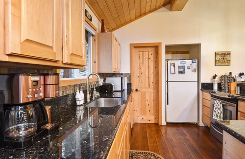 The Knotty Pine vacation rental is a single level 3 bedroom/2 bath that features a very open floor plan with the kitchen, living room and dining room open to one another and wood fireplace. The cabin has been very nicely remodeled with wood floors, updated kitchen and bathrooms, and tasteful furniture appointments. In the summer guests can enjoy the expansive side deck area and the property is within walking distance to the Tahoe Rim Trail. In the winter the house is very close to a great sledding hill and centrally located to Northstar California, Alpine Meadows, and Palisades Tahoe.