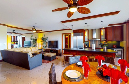 Inside, the open-plan living area welcomes you with warm, tropical décor and comfortable furnishings. The living room flows seamlessly to your private lanai, where ocean views and lush resort grounds create the perfect setting for morning coffee or sunset cocktails.