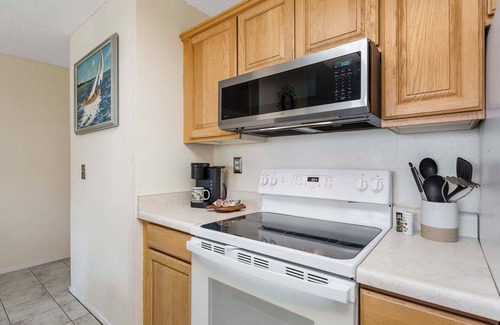 The kitchen comes fully equipped with all the equipment and small appliances you could need for an enjoyable vacation. This beautiful condo features air conditioning in the Living Room only, (Not Available in the Bedroom) and a washer/dryer. Although there is an elevator on-site, there are a few stepsthat must be walked to get to 2nd floor condos.