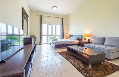 Furnished studio apartment in Mogul Cluster, Discovery Gardens. With spacious living/sleeping area, with Garden View, open plan kitchen with all appliances, bathroom with bathtub and WC, and large wardrobe. All utilities are included.