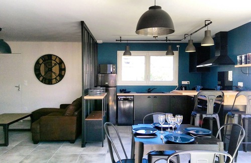 The house (85 m²) with the current deco industrial style, single-storey, non-terraced, accessible to people with reduced mobility, is composed of 2 bedrooms (1 with 1 double bed 160 and flat screen tv and 1 with 2 single beds : all bed bases are new as well as mattresses memory form), a bathroom with walk-in shower and towel dryer, a large living area with the living room, flat screen TV (106 cm) and the stove, an open kitchen fully equipped (dishwasher, microwave, hob, oven, hood, toaster, kettle, traditional coffee and Senseo, fridge-freezer, ...).