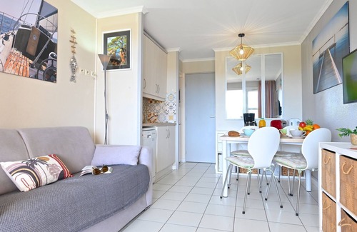 "L'Esquinade (F3 113)", 1-room studio 24 m2, on the ground floor. Object suitable for 2 adults + 2 children. Bright, renovated in 2022, comfortable furnishings: living room with 1 sofabed (140 cm, length 190 cm), TV (flat screen), fan. Exit to the terrace. Sleeping alcove with 1 x 2 bunk beds (90 cm, length 190 cm). Kitchenette (2 hot plates, dishwasher, toaster, kettle, freezer, electric coffee machine, combination microwave). Shower/WC. Electric heating. Terrace 8 m2, roofed. Terrace furniture, electric barbecue. Beautiful view of the sea and golf course. Facilities: Internet (WiFi, extra). Parking (1 car). Please note: non-smokers only. 1 small pet/ dog allowed. Smoke alarm. Instead of an enclosed bedroom, some sleeping areas are located in an open-plan area (gallery, alcove, etc.). Offer by a private individual according to Art. 155, IV of CGI.