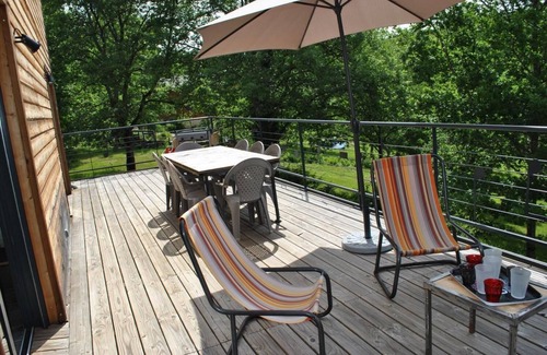 Like the musical scope represented on the railing of the terrace of this bioclimatic house in wood frame totally turned towards nature, we let ourselves be carried away by the atmosphere that reigns at this place! Outside, the song of birds in the wood nearby or exotic birds of a nearby home, gives a change of scenery on the terrace or by the pool! Inside, we like the large volume of the living room decorated with large windows opening onto the terrace and nature , we also like this harmonious alliance between wrought iron (brilliantly worked by Jean-Philippe!) and wood, and all the equipment that is very comfortable. Jean-philippe and Francine will have at heart to introduce you to the region which is particularly rich of essential tourist sites near the cottage...and who knows, Maybe you will be able to convince the owners to say what this ballad is represented on the railing!!! Entrance porch, then on the same level large living room/ dining room/ fully equipped built-in kitchen (refrigerant with freezer compartment, dishwasher, microwave,...), separate toilet, bathroom with large walk-in shower (washing machine), bedroom with 1 bed 140. On the 1st floor: 1 mezzanine (with a reading area and games), 3 bedrooms of which 1 with 2 beds 90, 1 bedroom with 1 bed 160 and 1 bedroom with 1 bed 140, a bathroom with toilet, large Italian shower. Terrace that makes the tour of the house, the whole ground floor on one level, without any walk to the private pool with wooden terrace. Open ground. Parking. Private swimming pool of 4m wide, 6.75 long and 1.50 deep secured by alarm. Not adapted disabled.