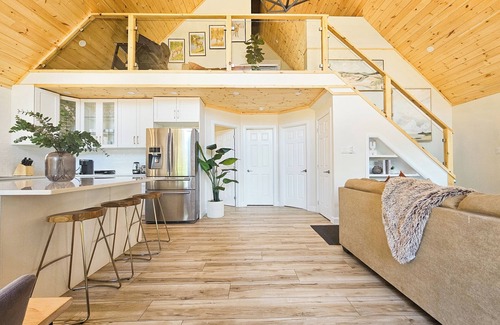 This waterfront retreat features vaulted pine ceilings, floor‑to‑ceiling windows, a chef’s kitchen, and spa‑style bathrooms designed for luxurious comfort. The sunlit living area flows effortlessly onto a riverside deck and hot tub—a perfect vantage for golden‑hour views and unwinding in nature. With 3 bedrooms, 2 baths, and space for up to 9 guests, every detail merges contemporary elegance with cozy rustic charm.