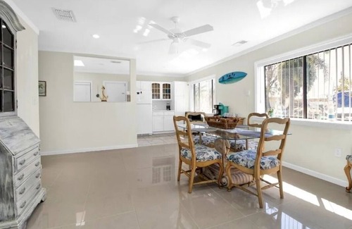 THIS LOVELY FLORIDA, 3- BEDROOM HOME, has everything needed for an enjoyable, relaxing FLORIDA VACATION!! THIS GULF ACCESS, WATERFRONT HOME, located on a SALTWATER Canal, WITH QUICK ACCESS. out to Bay, You will find an adequately equipped Kitchen, a Dining room, Family room, 3 Bedrooms, Fresh Linens and a Full Bathroom (tub shower combo), Free WIFI, plus a free onsite Washer and Dryer for Guest usage. Park in the carport to keep car out of the Sun. There is plenty of outside space with a fully fenced in back yard for the young ones and Pets to run and play. Enjoy BBQing on the 2 outside patios during the day and evenings. Stroll down to the Backyard's Waterfront Dock and elevated Deck for some Fishing, Boating, Kayaking, jet skiing, sunbathing or to sip on a cold Margarita while watching the Manatee and Boats go by! Just 3 mins away from the Home is the Community Beach, Pool, Park, Fishing pier, and boat ramps plus kayak rentals. Plenty of Fun in the Sun for the whole Family!! Our Home is also close to several Golf Courses, Grocery stores and various shopping malls with Popular well known Names. After a long fun day out and about, it's time to relax.... Come back to Your Home away from Home, and enjoy the refreshing Central A./ C grab some dinner at home or head out to the Many Nearby Restaurants, Bars and Grills available in the area. Once again, The SUNSEEKERS RESORT has spas, boardwalks, marinas, and OVER 15 Eateries / Restaurants / Bars all open to the Public, accessible by Car or Boat. We know you and Your Family will enjoy Our Home and its convenient location to everything!! PORT CHARLOTTE is known for its "WORLD CLASS FISHING," with a variety of species to be caught!! We have enough Parking Spaces for 3 Vehicles, Plus A Large RV Parking space, or can be used for 3 additional Vehicle spaces. There is a fee charged for pets, Please let us know if you will bring any and we will add the charge on our end after you have booked. (There are 3 total Cameras on site, none are connected to a service or the Ring control panel, the 1 in carport and 1 on front of home are solar and are just used as motion lights and as deterrent, there is 1 in the kitchen / dining area which was kept up as a deterrent as well.)