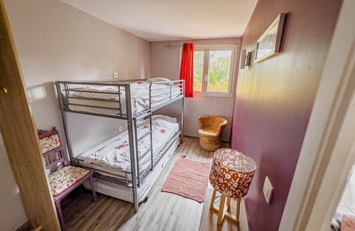 Ground floor gîte of 65 m2 for 1 to 4 people comprising: living room with TV, fully equipped kitchen, shower room with washbasin, shower and wc, large bedroom with 160 cm bed, bedroom with bunk bed for 2 people, terrace with parasol, table and garden furniture, private entrance, patio at the rear. The swimming pool, gym, sauna, laundry room and petanque area are available to guests in all 5 gîtes. Air conditioning in every room, Wi-Fi, linen, towels and end-of-stay cleaning included.