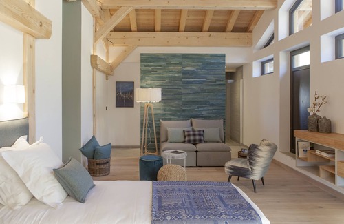- 1 master suite (40m²) with 2 twin beds (90x200) + office space + bathroom (bath and shower) + hair dryer + toilet. View of Aiguille Rouge.