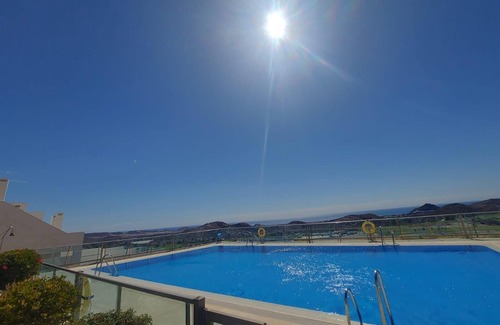 Beautiful & Comfortable Apartment for 6 in Pulpi, Andalusia, SpainEnjoy your holiday in this stylish and well-equipped apartment located in the scenic Mundo Aguilón holiday complex, nestled on the flank of the Sierra Aguilón in Pulpi, Andalusia. Perfect for families or groups of friends, this apartment accommodates up to 6 guests and offers a serene setting just 3 km from the beautiful Playa la Entrevista beach.Apartment Highlights:Located in a modern resort complex with bar and restaurantSpacious and comfortable accommodation for up to 6 peopleRecently refreshed interior with all modern comfortsPrivate terrace with sitting and dining areas2 private covered parking spaces + additional communal parkingSpectacular Views: