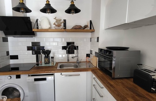 Kitchen side: open to the living room, fully equipped (3 induction burners, combined microwave oven, fridge, freezer, dishwasher, washing machine, Senséo coffee maker, toaster and kettle) with a standing table for 4 people which will allow you to accommodate your meals and guests.