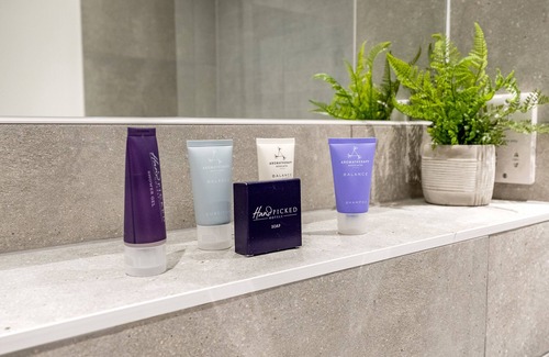 The sleek bathrooms are tiled with a clean, modern finish and feature a large walk-in shower, wash basin and w.c. They are well-proportioned with overhead showers, hand-held shower, and heated towel rails. Aromatherapy Associates toiletries, eye masks, and slippers are provided with our compliments for each guest.