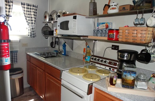 A park like setting of over an acre of nature’s beauty. Wildflowers and flowering trees a-plenty adorn this 2 bedroom cabin that has a separate laundry room building with a carport and a party pavilion for cookouts. The kitchen is well-stocked with everything you need to prepare meals in or cookout on the grill. The cabin comfortably sleeps 4 people and an additional sectional couch for one more adult or two small children.