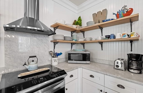 One of the home’s bedrooms and full bathrooms is also located on the first floor; though, most of the living space is upstairs. The second floor has two elegant master suites with king beds and two private en suite bathrooms. Access to the second-floor covered balcony is afforded from the master suites.