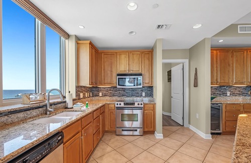 THE SPACE: The beautiful condo features beautiful floor to ceiling glass for spectacular views from any room. Cook your beach specialties in the fully stocked kitchen with upgraded appliances, a regular coffee pot and a Keurig. The wet bar features a sink and has a beverage fridge. The spacious living area is open to the kitchen and dining area with seating for six at the dining table and three at the island. For your entertainment, every bedroom has a TV. Enjoy your morning coffee on the oversized balcony accessible from the living room and master bedroom! With privacy for everyone, each bedroom has its own bath. The master bedroom has a king bed, an ensuite master bath with a walk-in shower, separate jetted tub and double vanities. Bedroom 2 has a queen over queen bunk bed with a pull-out twin trundle and an ensuite bath with a tub/shower combination. Bedroom 3 has a queen bed and ensuite bath with a tub/shower combination. The laundry room has a full-size washer/dryer and is large enough to store your beach gear. This condo comfortably sleeps nine people. Free Wi-Fi and cable are provided during your stay.