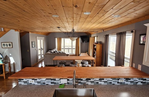 This beautiful and inviting vacation home on Dale Hollow Lake is tucked away in a peaceful wilderness setting, providing a relaxing “cabin in the woods” feel with all the modern conveniences you need for your stay. Hardwood floors and custom wood plank ceilings throughout bring the nature inside making the home feel cozy and comfortable.