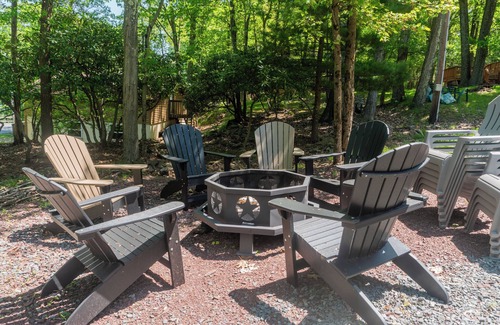 The Lake Woods House is situated on a wooded lot, with an open area fire pit. There is also plenty of seating on the wrap around decks, with a four-burner propane grill.